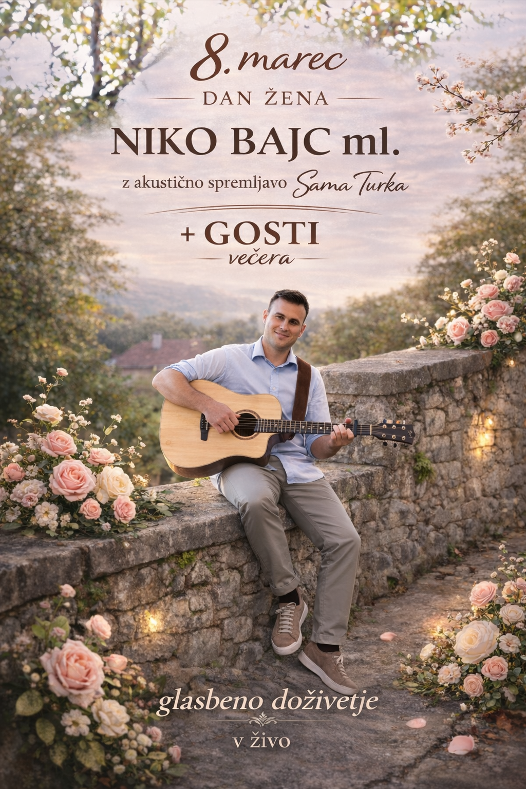Vabljeni na glasbeni večer za Dan žena! Čaka nas pravo glasbeno doživetje v živo! Z nami bo Niko Bajc ml. z akustično spremljavo Sama Turka in gosti večera.